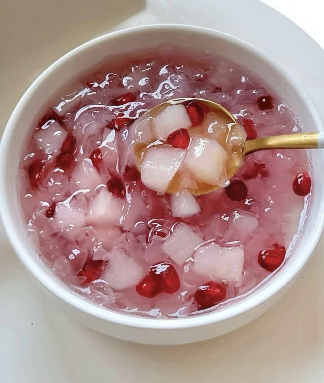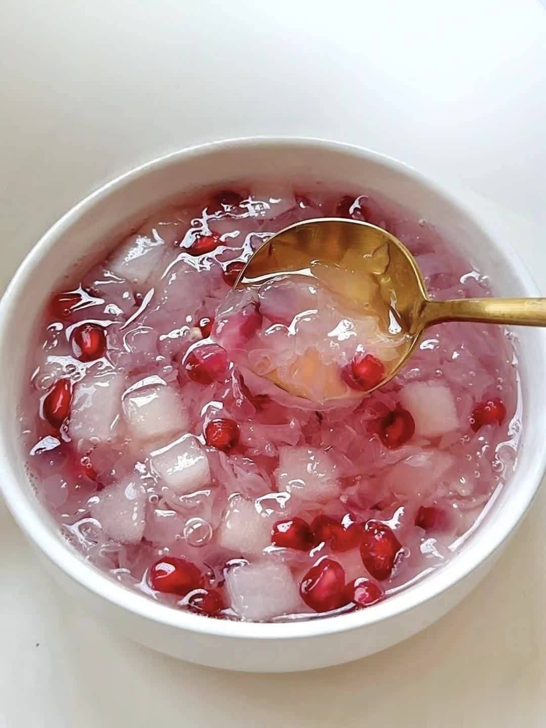 一碗粉粉嫩嫩的石榴银耳羹就做好了,舀一勺,银耳的软糯胶质包裹着石榴的爆汁清甜,从喉咙一直润到心里,感觉每个细胞都在喝水!当早餐或者晚餐后的甜点,都超级赞!